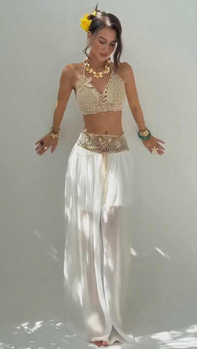 Combine este conjunto com sandálias de tiras e acessórios naturais para um look boho autêntico. Para um visual mais sofisticado, adicione um chapéu de palha e joias douradas delicadas — o toque perfeito para férias à beira-mar ou jantares tropicais.